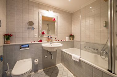 Badezimmer mit Bad oder grosser Dusche, WC, Handtücher, Haartrockner, kostenfreie Pflegeprodukte.