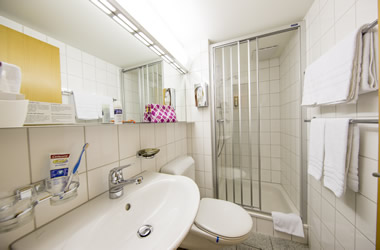 Badezimmer mit Bad oder grosser Dusche, WC, Handtücher, Haartrockner, kostenfreie Pflegeprodukte.